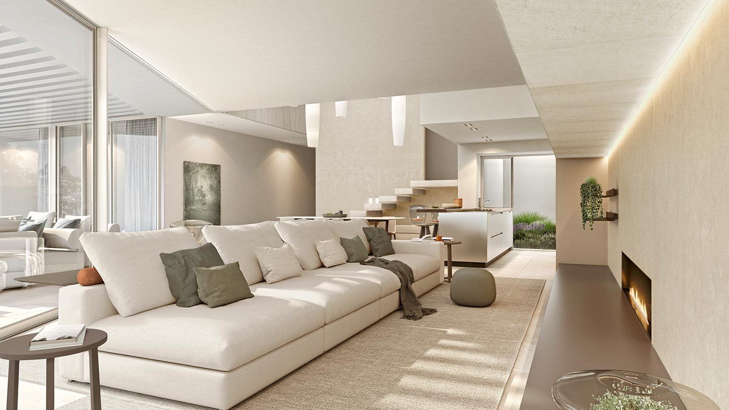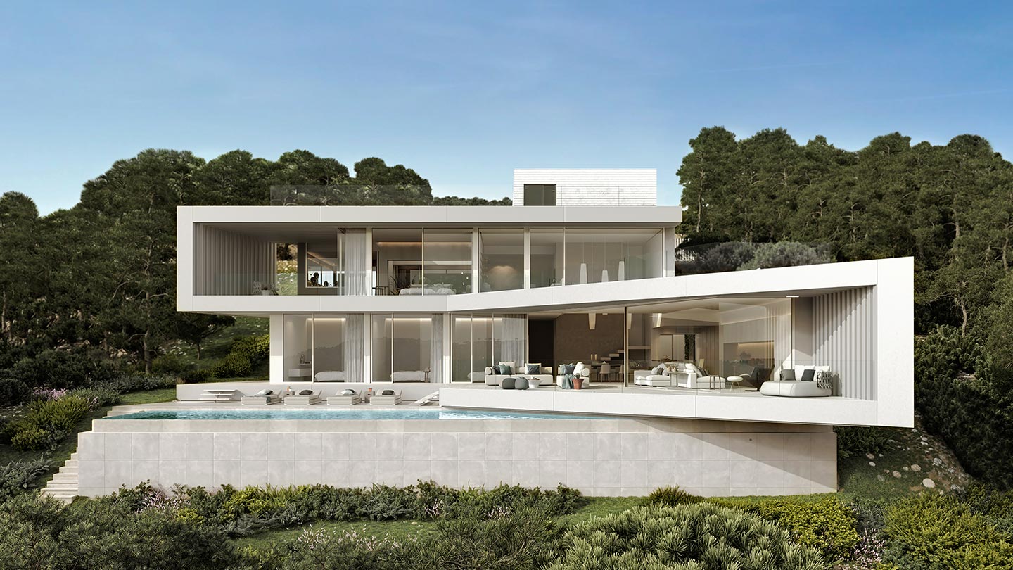 泳池露臺(tái)上設(shè)有戶(hù)外客廳,讓您盡情享受地中海的宜人天氣。在豪華別墅內(nèi),一個(gè)內(nèi)部客廳展開(kāi),帶有一個(gè)雙面休息室和一個(gè)正式的用餐區(qū)。四盞大型餐廳吊燈從空間中心令人印象深刻的天花板高度下降,更多的藍(lán)天穿過(guò)白色混凝土結(jié)構(gòu)。