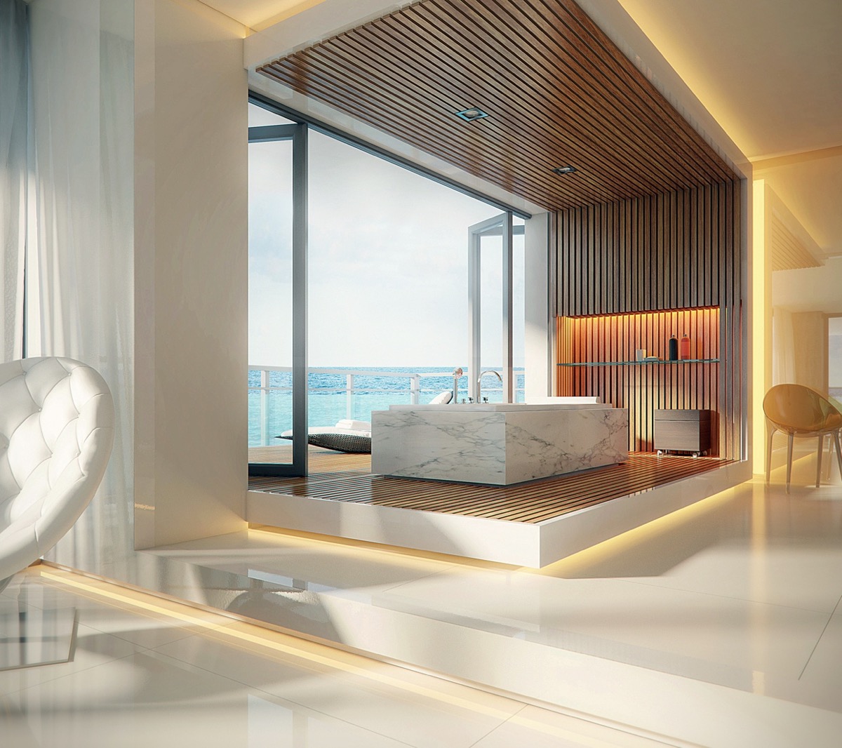 氣候溫暖的主浴室可以與戶外無縫連接……