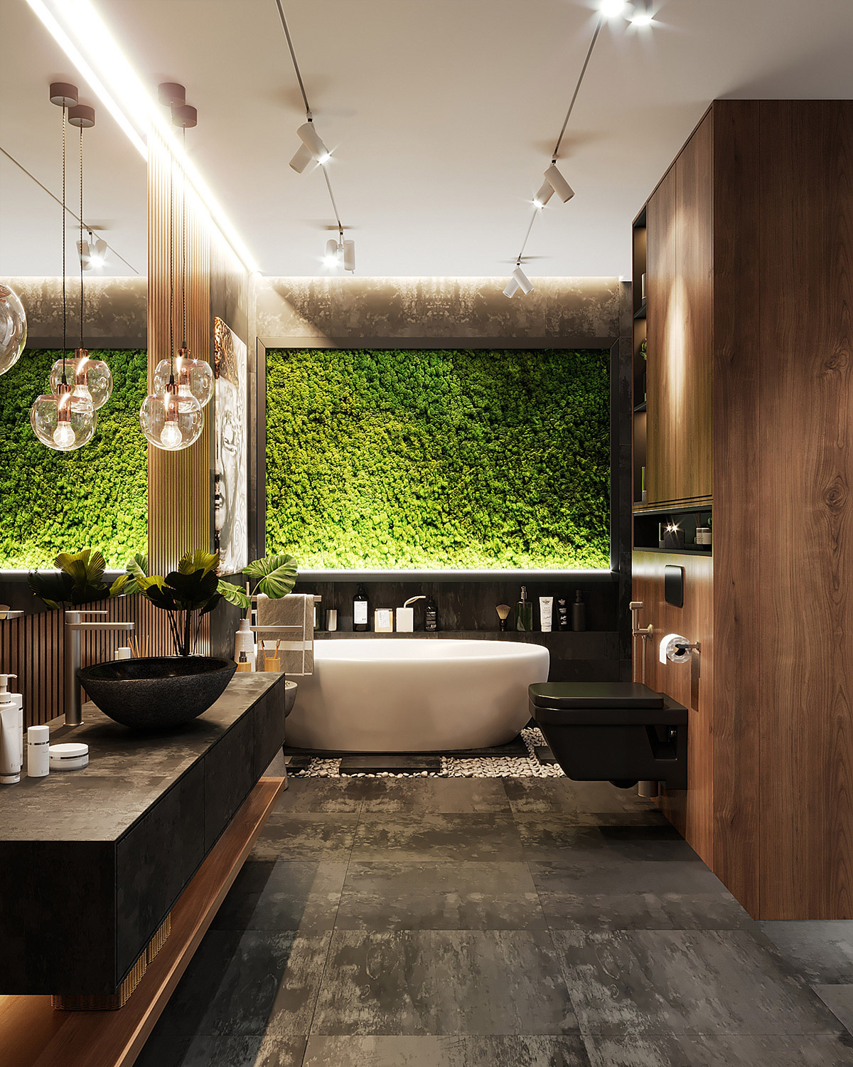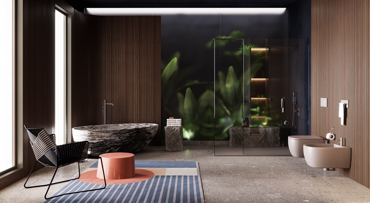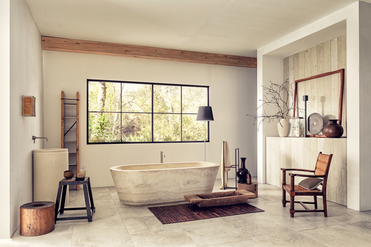 在浴缸下方放置一張鵝卵石床,將裝飾與花園背景連接起來——無論是生活墻、浴室庭院還是壯麗的景色。