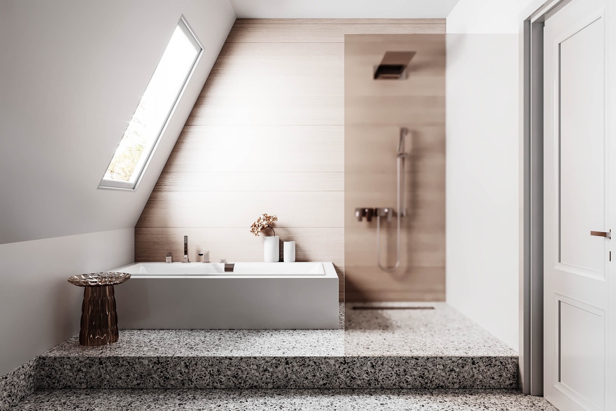 分而治之。建造一堵分隔墻來隔開一個大淋浴房,然后使用新的墻壁空間來放置一個漂亮的浴缸。