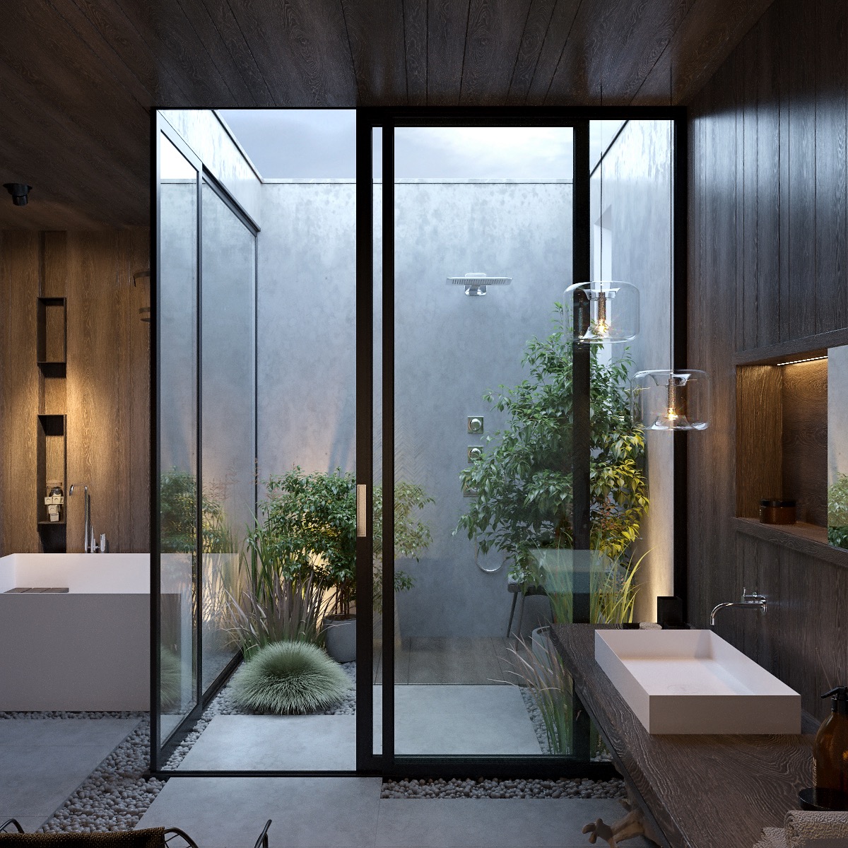 擠在一個人造庭院里。您的主浴室設(shè)計是否只有站立空間?不用擔(dān)心,植物可以與您共享淋浴間。瞧!一個玻璃庭院。