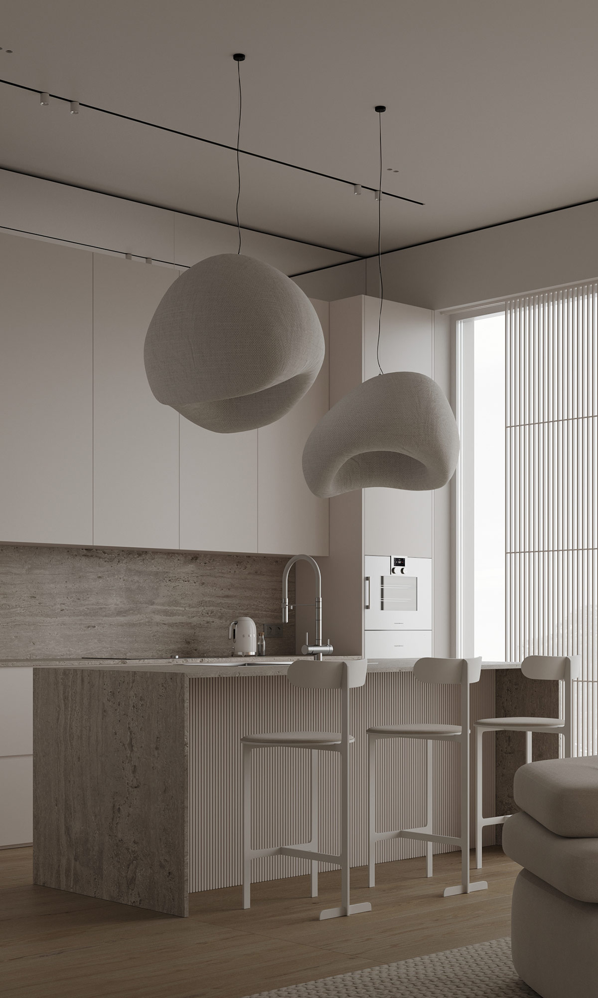 平面、無(wú)把手的白色廚柜悄悄地消失在房間的后面。美麗的米色石材后擋板穿過廚房的中央,被櫥柜底燈的溫暖光芒照亮。