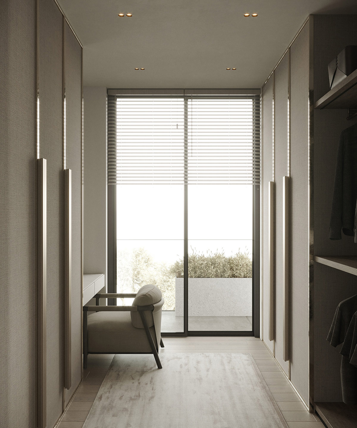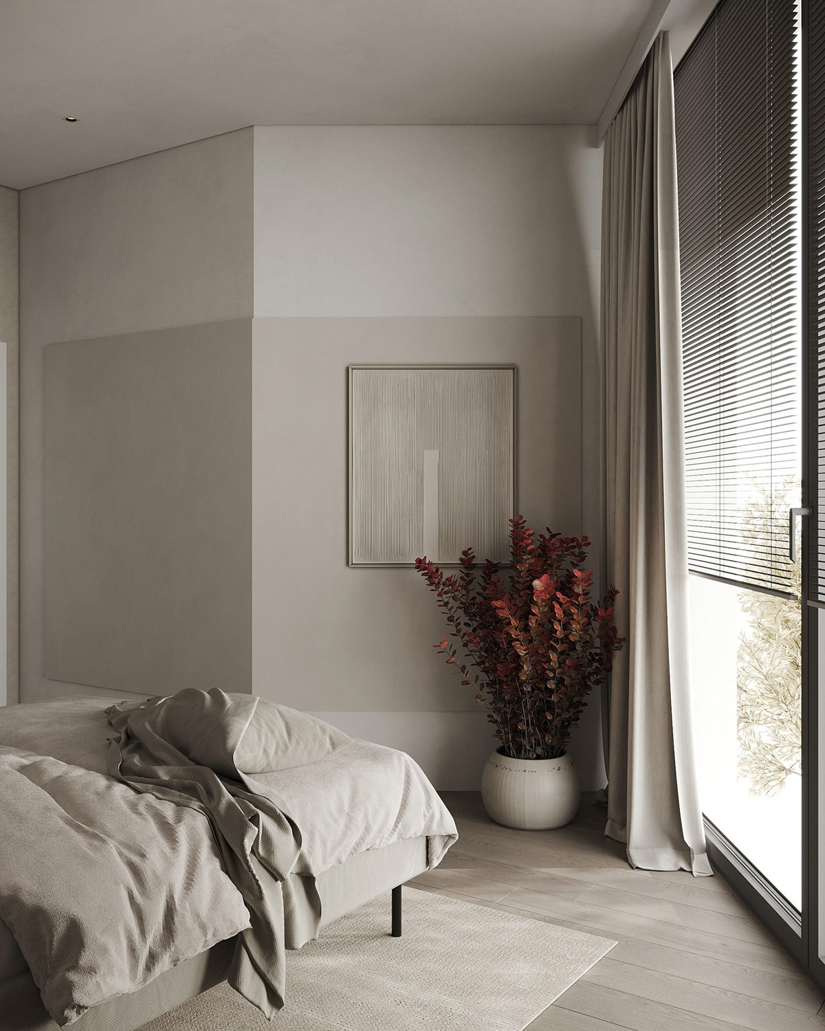 彎曲的墻壁掃入臥室入口,形成一個(gè)宏偉的入口。