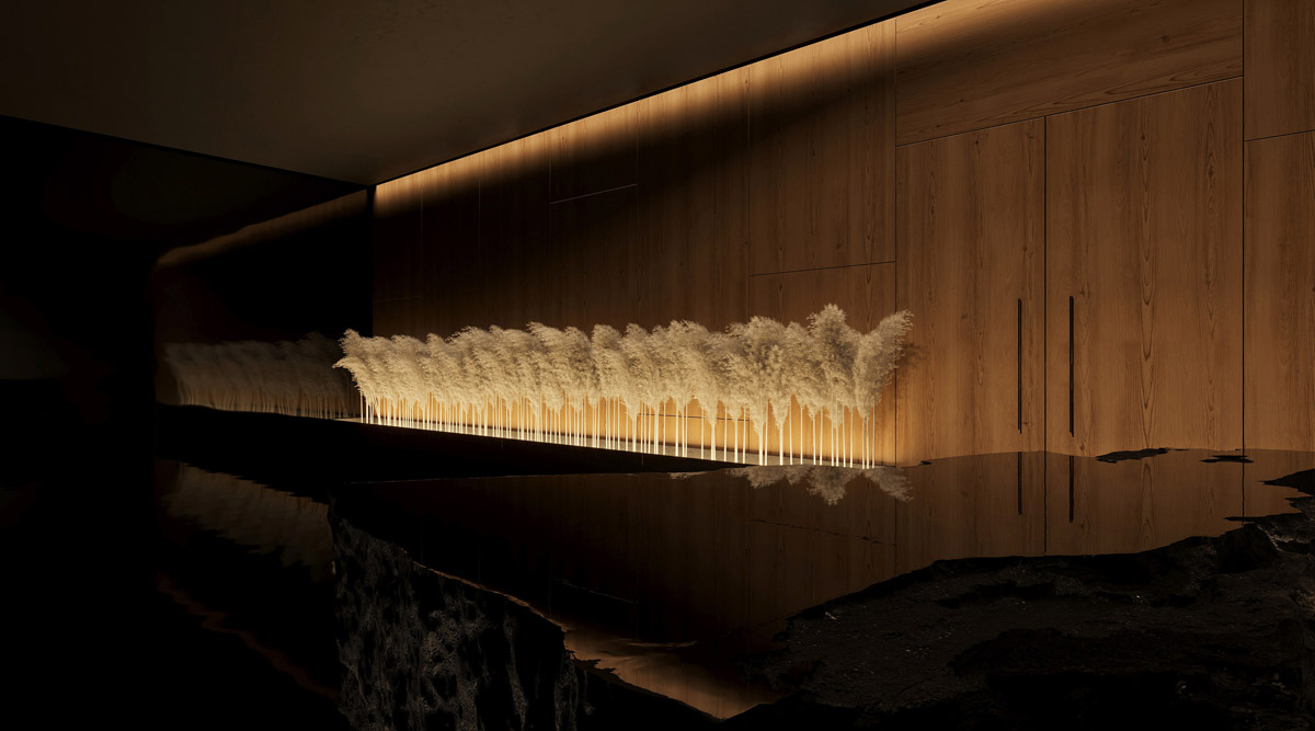 在集中的照明裝置下,一簇簇白色的潘帕斯草令人著迷。