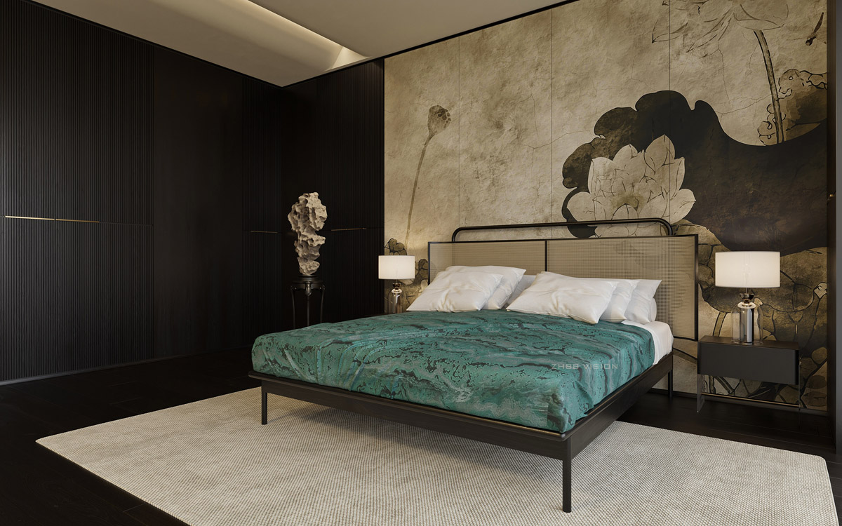 定制床頭板設(shè)計的背面呈現(xiàn)出中國傳統(tǒng)場景。