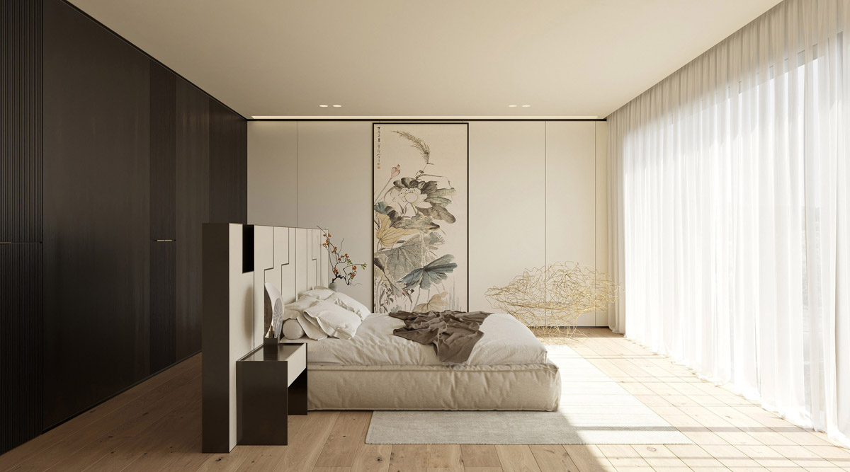 當(dāng)我們躡手躡腳地穿過這套豪華的中式別墅內(nèi)部時,一種寧靜的感覺涌上心頭,每一個都開放而寬敞,并以平靜的簡潔色調(diào)和精致的細節(jié)裝飾。這些空間讓人想起江南的美麗風(fēng)景,江南風(fēng)景如畫的土地位于長江下游。這些寧靜的河畔記憶激發(fā)了充滿水的庭院,反射池環(huán)繞著雄偉的樹木,五顏六色的錦鯉在游動。光線充足的起居室和寬敞的餐廳提供了令人振奮的場所,讓大批朋友和大家庭可以聚集到晚上進行社交。傳統(tǒng)的茶室尊重由來已久的儀式。