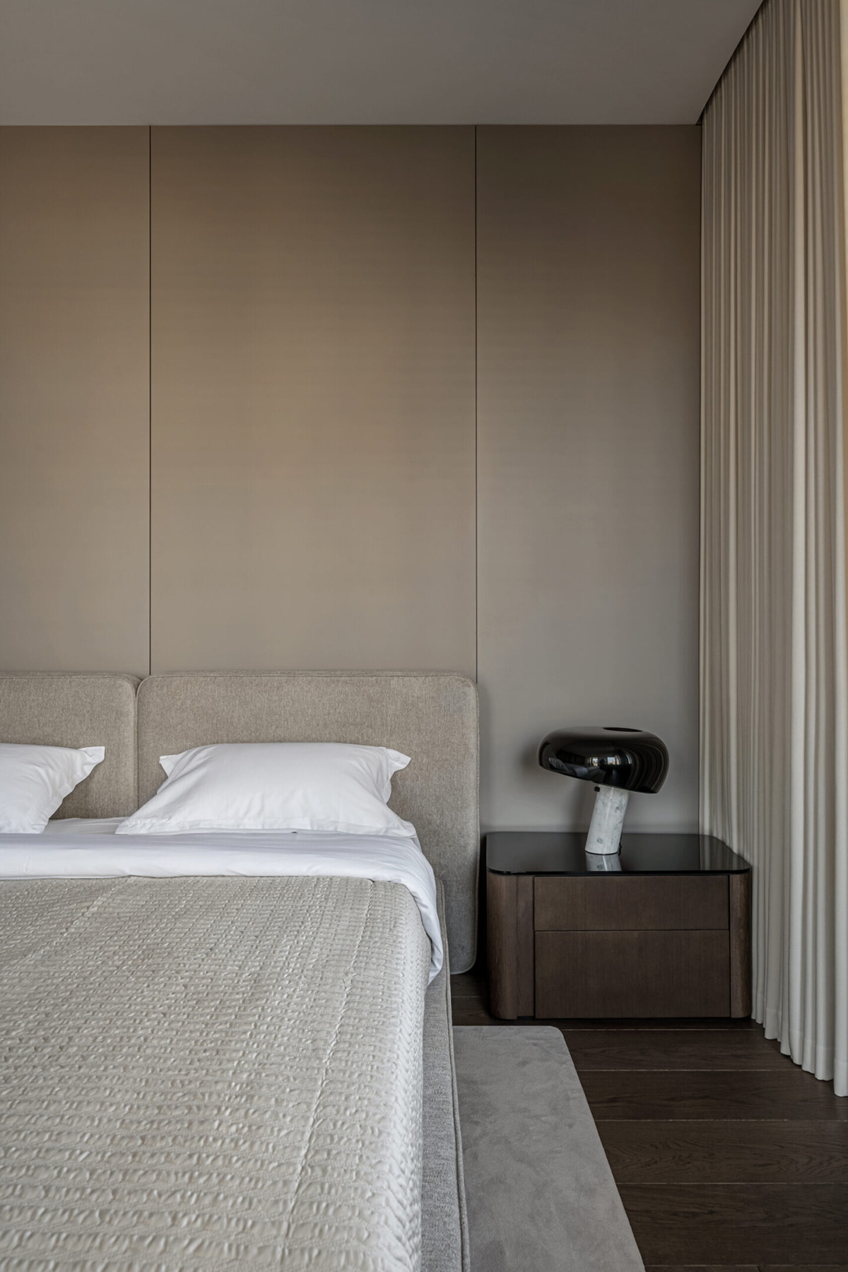 在第二間臥室內(nèi),黑色和木質(zhì)床頭柜與米色軟墊床和床頭板形成鮮明對(duì)比。時(shí)尚的床頭臺(tái)燈是 Flos Snoopy Lamp。