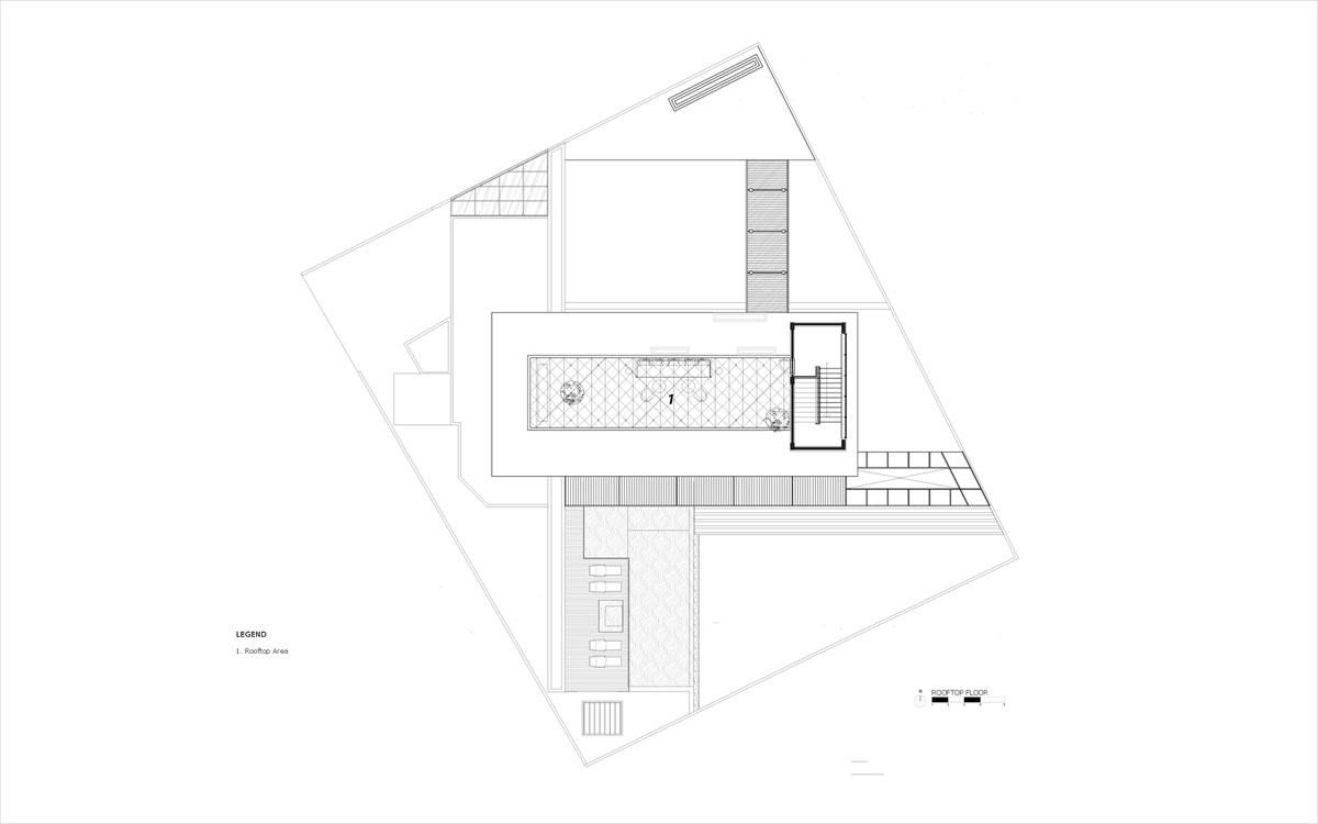 大型屋頂區(qū)域為戶外活動、一起放松、享受燒烤和招待客人提供了額外的空間。幾何地磚在露臺上呈現(xiàn)出時尚的圖案。